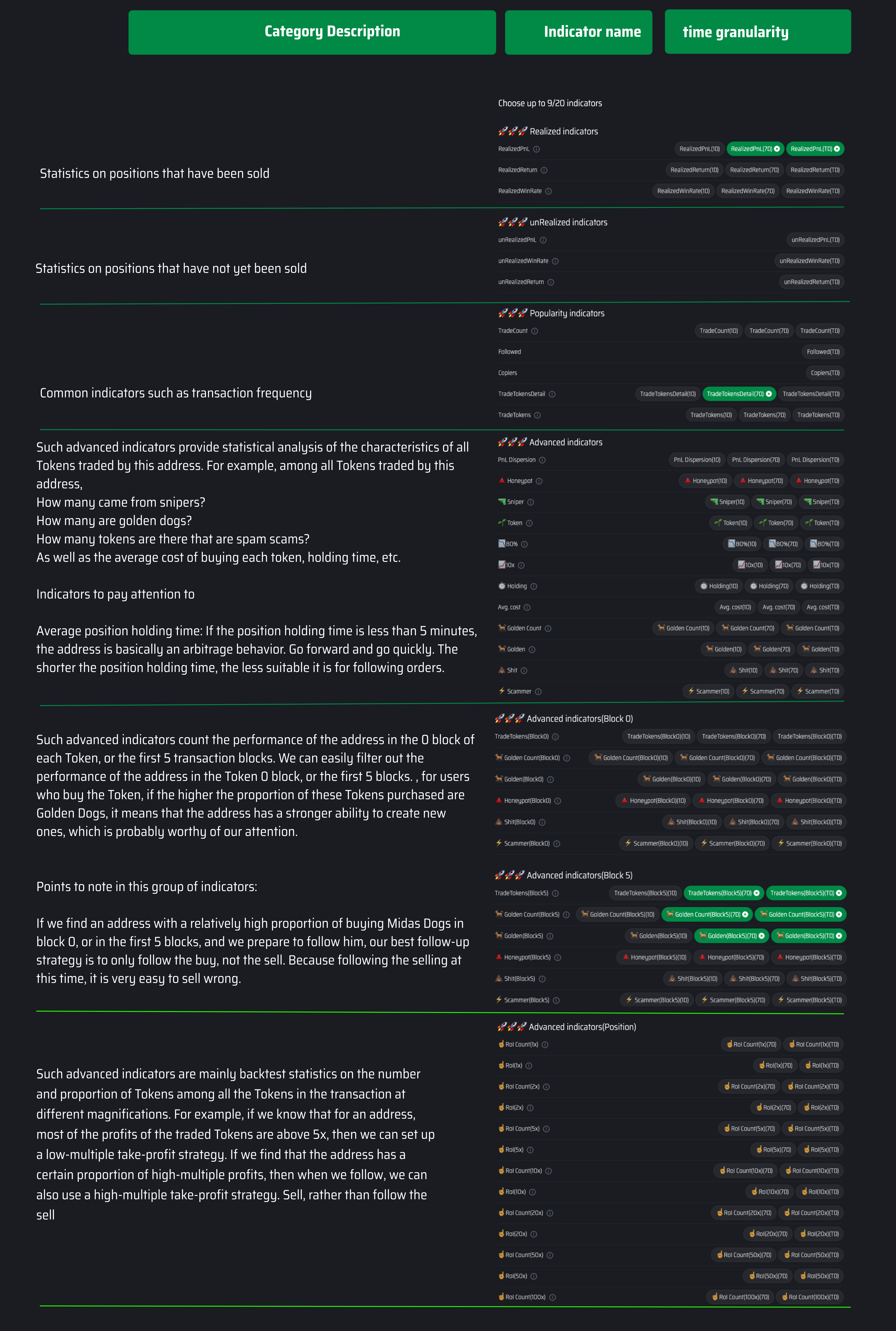 In order to screen smart money addresses more accurately, LogEarn provides a very complete indicator system. Each indicator can help us better evaluate the address from a certain dimension. The detailed indicators are as follows: